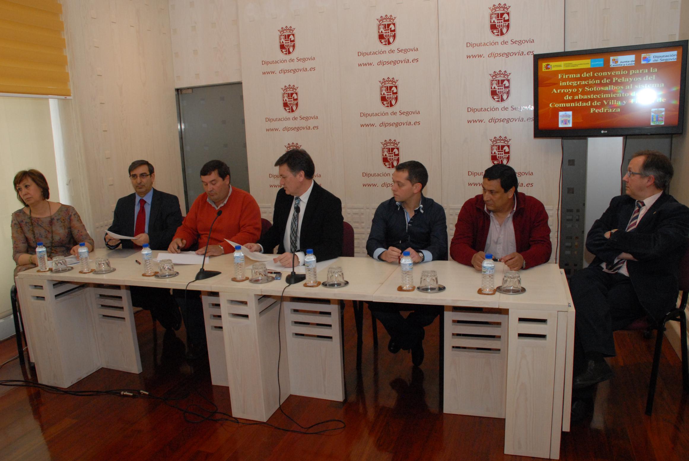 El Presidente de la Diputación Provincial de Segovia, Francisco Vázquez, ha firmado hoy un convenio de colaboración con su homólogo en la Comunidad de Villa y Tierra de Pedraza, Manuel Ballesteros y con los alcaldes de los ayuntamientos de Sotosalbos y Pelayos del Arroyo, Feliciano Isabel y Francisco Javier Rodríguez, para mejorar el abastecimiento de agua en estos dos municipios. En el acto han estado presentes la Subdelegada del Gobierno en Segovia, Pilar Sanz y el Delegado Territorial de la Junta, Javier López-Escobar, al ser dos de las administraciones que financiarán este proyecto, además, también ha participado en la firma el Diputado de Acción Territorial, José Luis Sanz Merino.